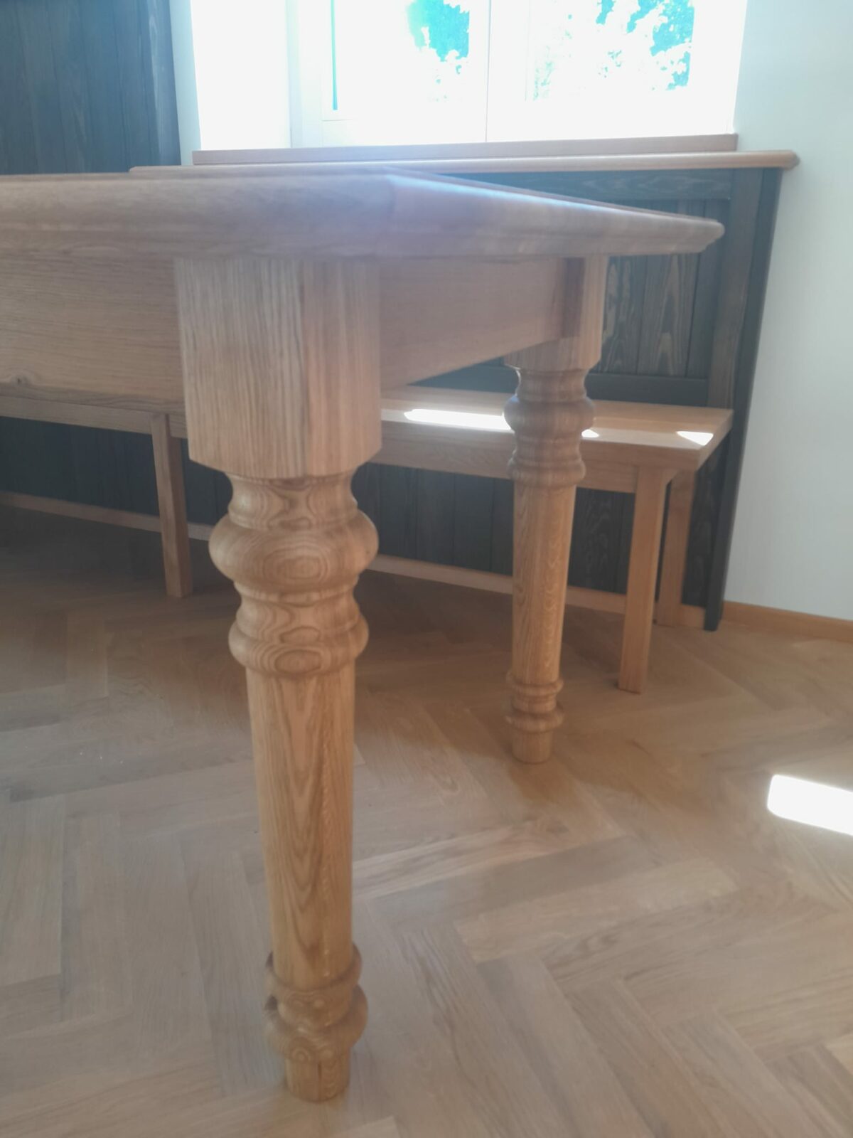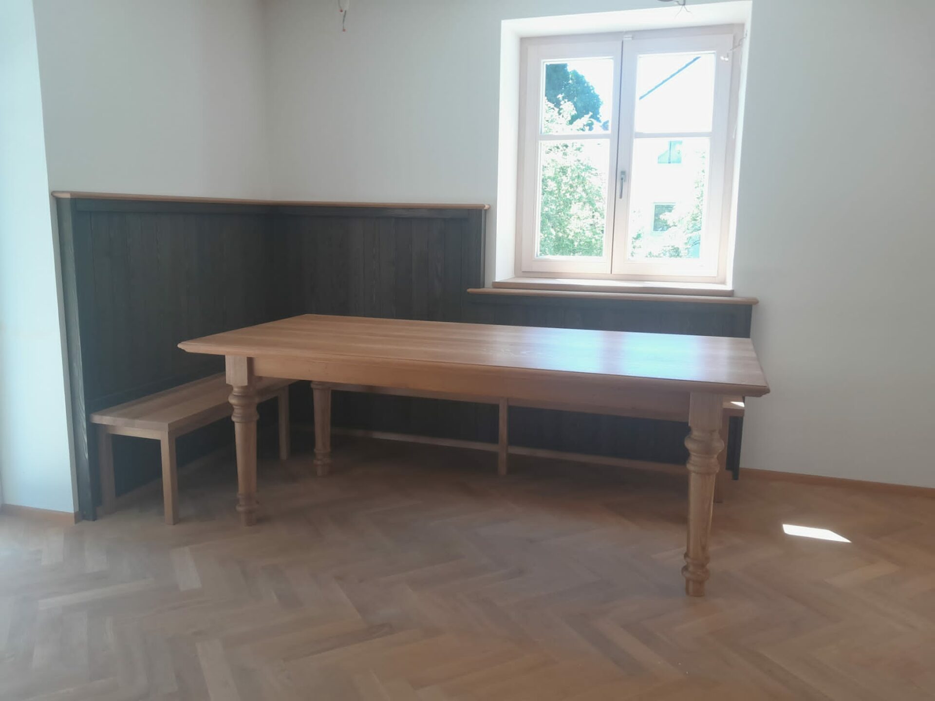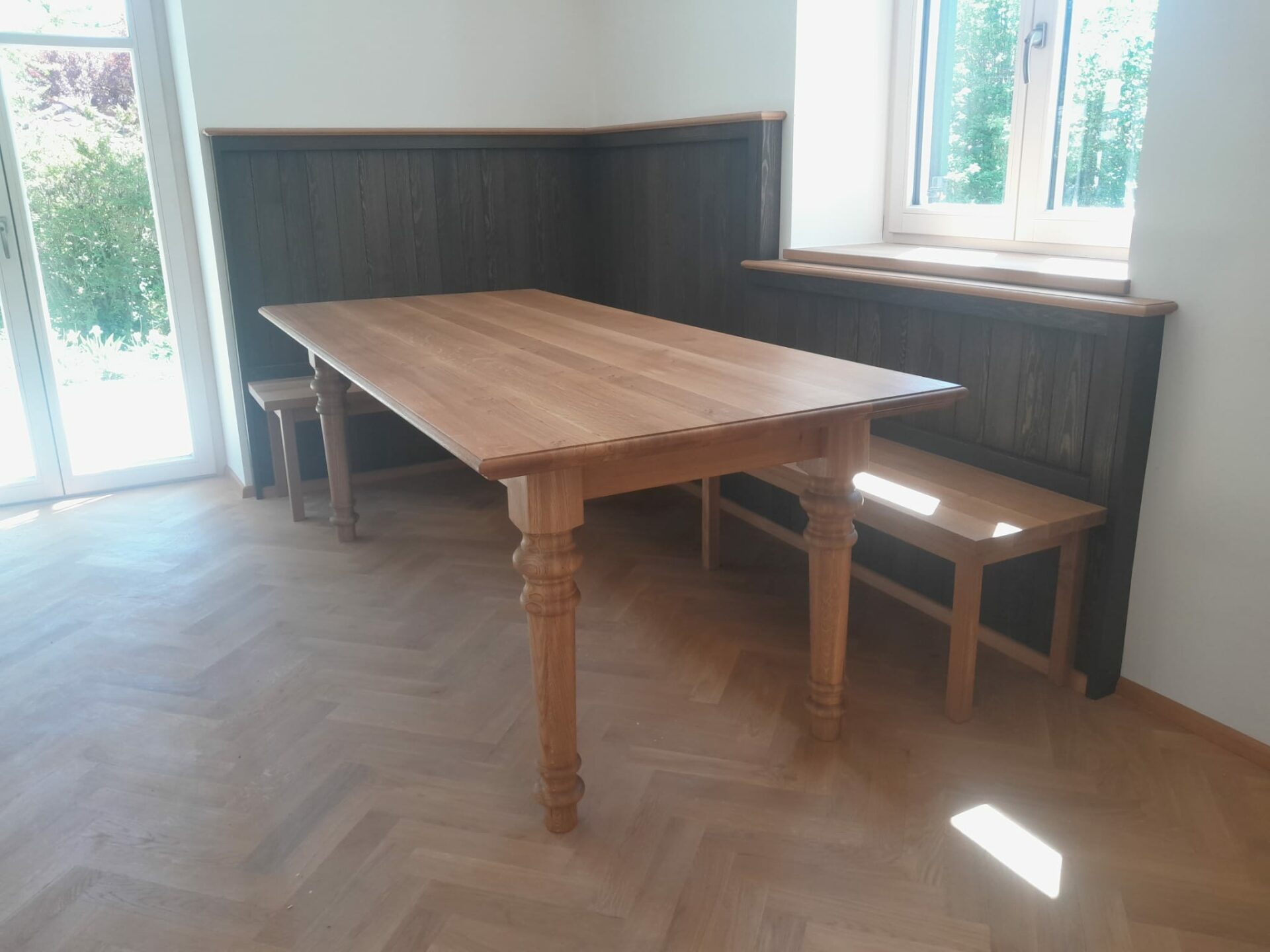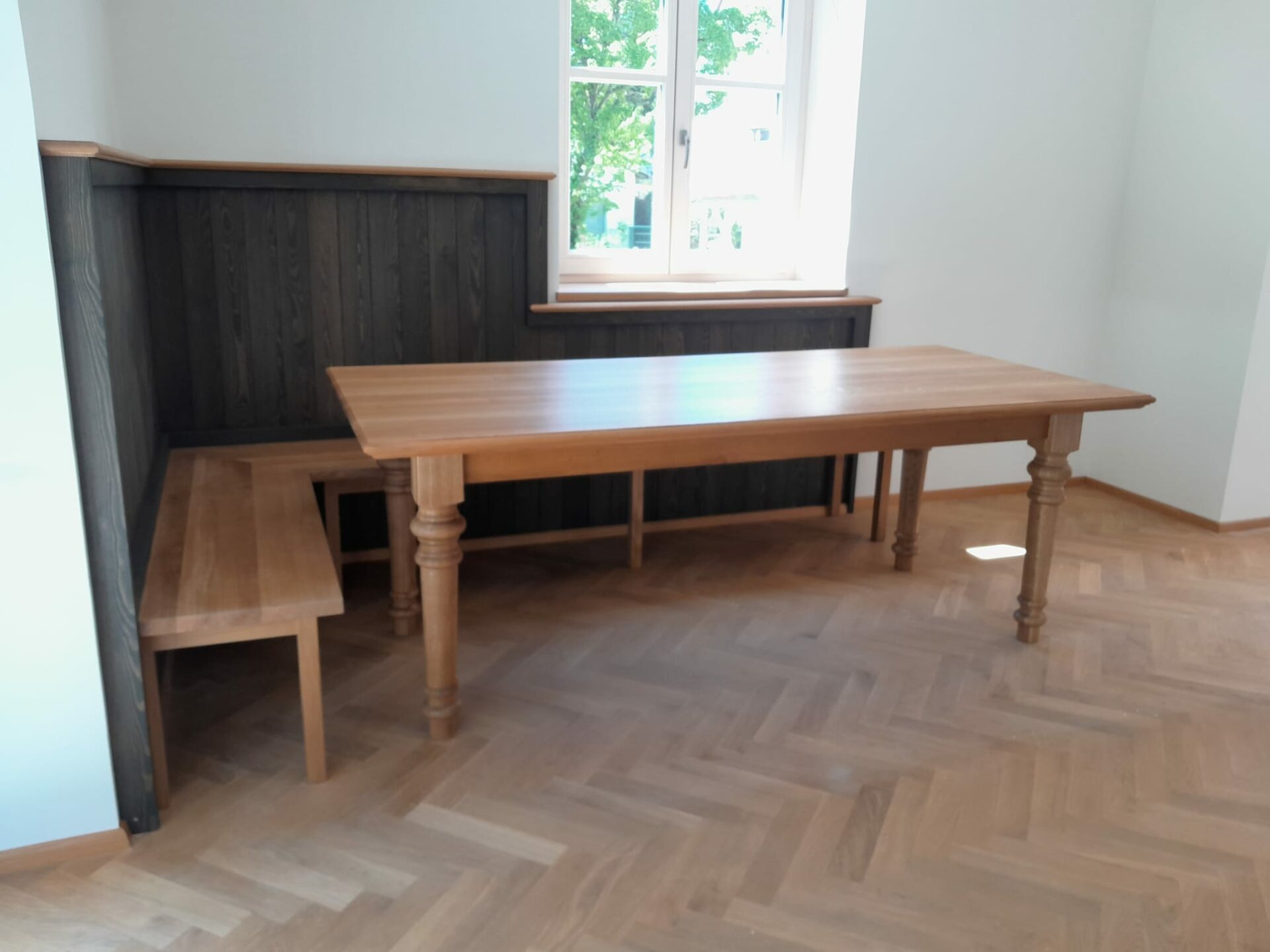 Eiche Tisch Füße derechselt  Rückwand Fichte Ebenholz geölt Sitzbank Eiche